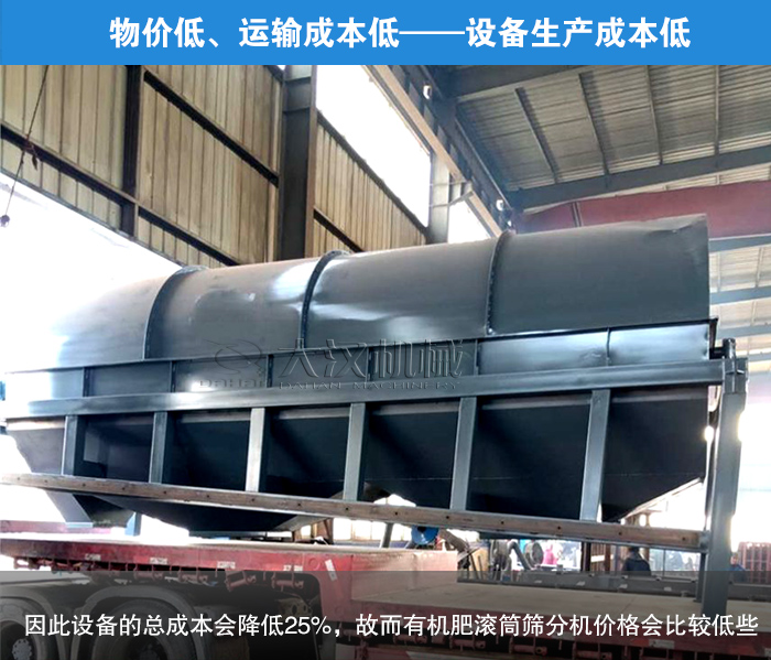 大漢公司位于新鄉(xiāng)大漢,設(shè)備的運輸非常方便快捷、省時省力,免除了40%以上的成本費用,且新鄉(xiāng)人力、物力資源豐富,生產(chǎn)設(shè)備花費的制造成本也相對減少10%左右,因此設(shè)備的總成本會降低25%,故而有機肥滾筒篩分機價格會比較低些。