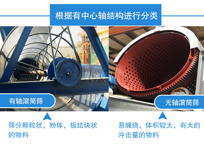 滾筒篩可以分為有軸滾筒篩與無軸滾筒篩,這兩者的區別在于其中心軸,其中有軸的滾筒篩可以篩分顆粒狀,粉體,板結塊狀的物料,而無軸滾筒篩采用無軸設計,可以對易纏繞,體積較大,有大的沖擊量的物料的篩分與篩選。