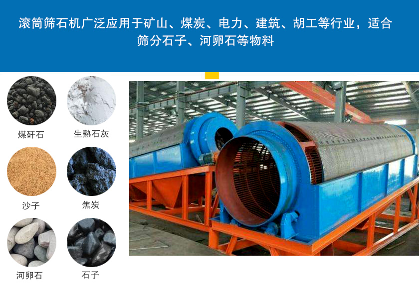 滾筒篩石機(jī)廣泛應(yīng)用于礦山、煤炭、電力、建筑、胡工等行業(yè),適合篩分石子、河卵石等物料,也可用戶篩分煤矸石、生熟石灰、沙子、焦炭等潮濕性易堵塞的物料。
