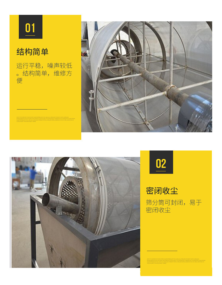 2、篩筒內(nèi)設(shè)置有自清掃裝置,篩孔不易堵塞。