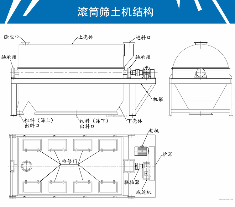 滾筒裝置在驅動裝置的驅動下轉動,當物料進入滾筒裝置后,由于滾筒裝置的傾斜與轉動,使篩面上的物料翻轉與滾動,使合格物料(篩下產品)經滾筒后端底部的出料口排出,不合格的物料(篩上產品)經滾筒尾部的排料口排出。