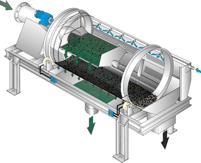 大型滾筒篩主要有電機、減速機、滾筒裝置、機架、密封蓋、進出料口組成。滾筒裝置傾斜安裝于機架上。電動機經減速機與滾筒裝置通過聯軸器連接在一起,驅動滾筒裝置繞其軸線轉動。